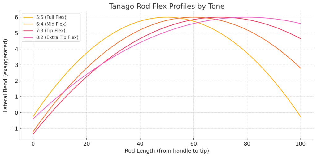 The next consideration when selecting a rod is the flex, which is usually given using a tone scale. The tone scale, typically expressed as a ratio like 5:5, 6:4, or 7:3, describes how much of the rod bends under load and where along the blank that flex occurs. A 5:5 tone bends deeply and evenly from butt to tip, offering maximum sensitivity and cushioning for ultra-fine lines and microhooks. This full-flex action is ideal for tanago fishing, as it helps detect the subtlest taps from tiny fish and prevents breakoffs on threadlike tippets. Stiffer tones like 7:3 or 8:2 shift the flex toward the tip, providing faster hooksets and more control in current, but at the cost of delicacy. Most dedicated tanago rods favor a 5:5 or 6:4 tone to strike a balance between featherlight touch and practical fishability. It can take some fishing to figure out what flex you prefer and getting a feel for a rod and its unique characteristics is very rewarding.